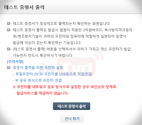 3. 새창으로 '테스트 출력'이 나오는데, 출력하실 분은 '테스트' 해 보시고, 열람만 하실분은 '건너뛰기'하셔도 됩니다.