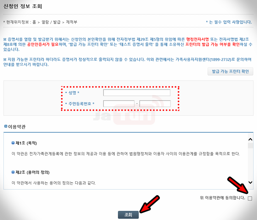 4. <신청인 정보 조회>에서 '성명 / 주민등록번호' 입력하고, 약관 동의 후 '조회'버튼을 눌러줍니다.